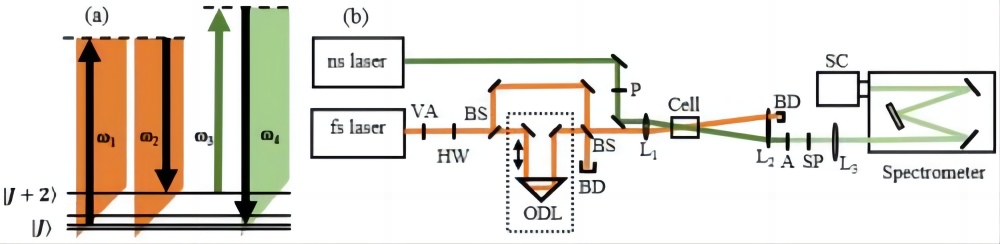 图 1. (a) RCARS的能量图,以及(b)实验装置的示意图