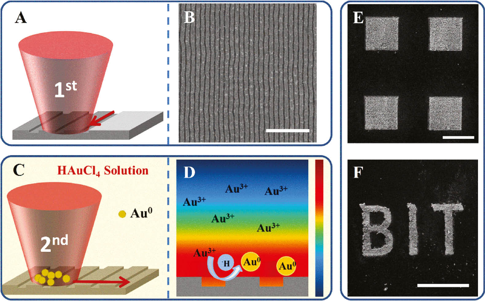(A)飞秒激光在空气中的照射。(B)周期性表面结构的SEM图像,比例尺为5 μm。(C)飞秒激光照射在含金溶液中3+.(d) 减少金3+因为 LOFE。(E)方形阵列的SEM图像,比例尺为100 μm。(F)比例尺为500μm的“BIT”形状的SEM图像。