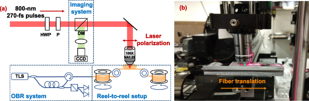 (a) 制造设置图。HWP:半波板;P: 偏光片;DM:二向色镜,TLS:可调谐激光源。(b) 激光书写制造装置的照片<span style="color: rgb(51, 51, 51); font-family: -apple-system, BlinkMacSystemFont, " segoe="" ui",="" roboto,="" "noto="" sans",="" ubuntu,="" "droid="" "helvetica="" neue",="" sans-serif;"="">。