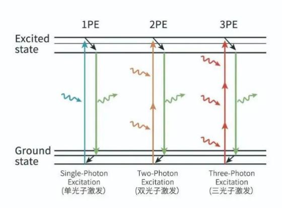 多光子显微成像技术的出现一定程度上缓解了成像深度不足的挑战。多光子成像基于多光子激发效应。荧光分子存在分立能级,能量最低的能级称为基态,大多分子处于此能级,能量较高的能级称为激发态。若存在特定波长的照明光,可以使处于基态的电子吸收若干光子,并跃迁到激发态,这些光子在激发态停留一定时间后再次弛豫震荡跃迁回基态,并产生一个对应波长的光子。若入射光波长较长,则可能使基态的分子同时吸收多个光子,即多光子激发。