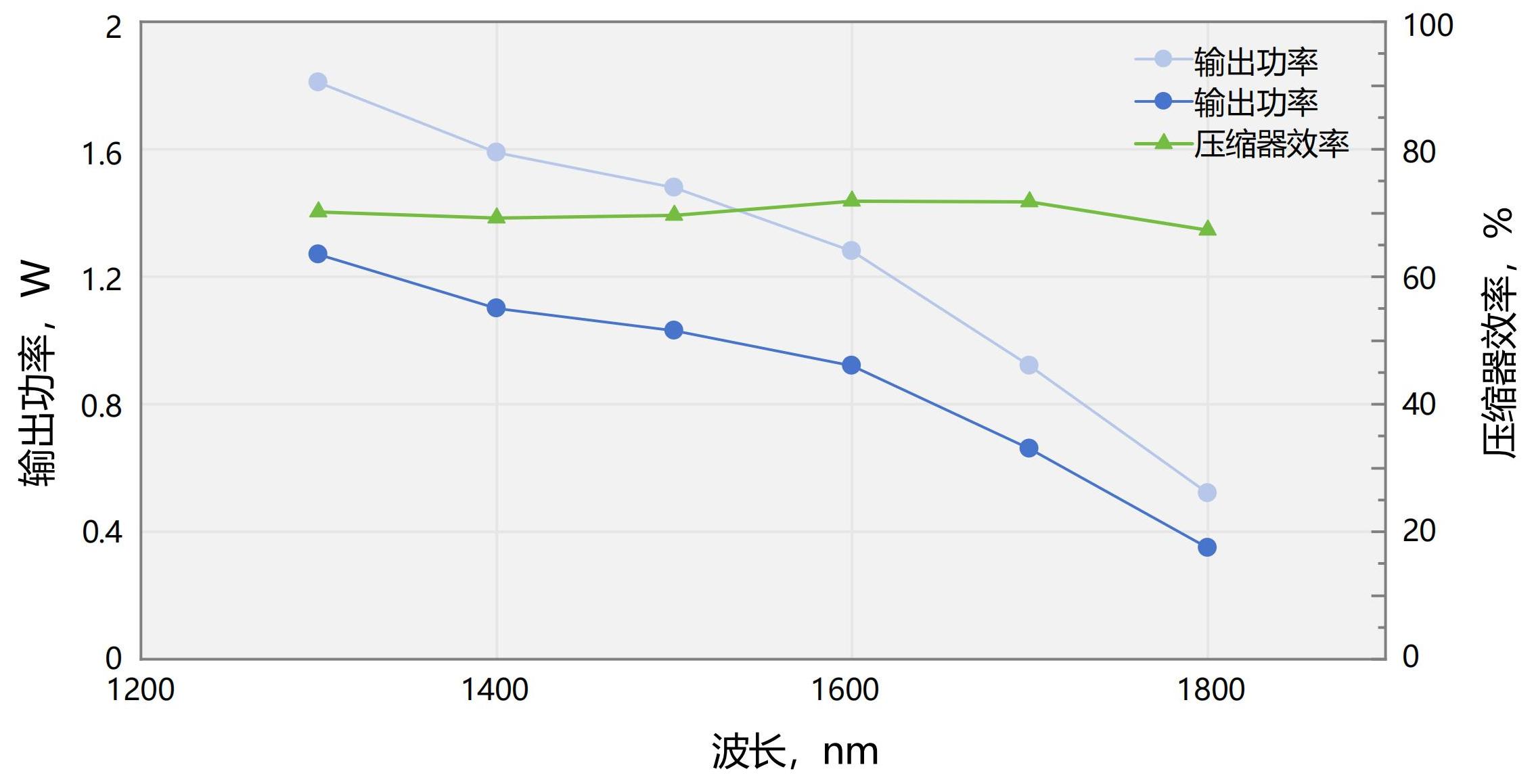 | 典型光谱 (1250-1800nm) | 三光子系统 + 压缩器输出功率对比(驱动激光:1MHz/40uJ/301fs@HELIOS-40W) |