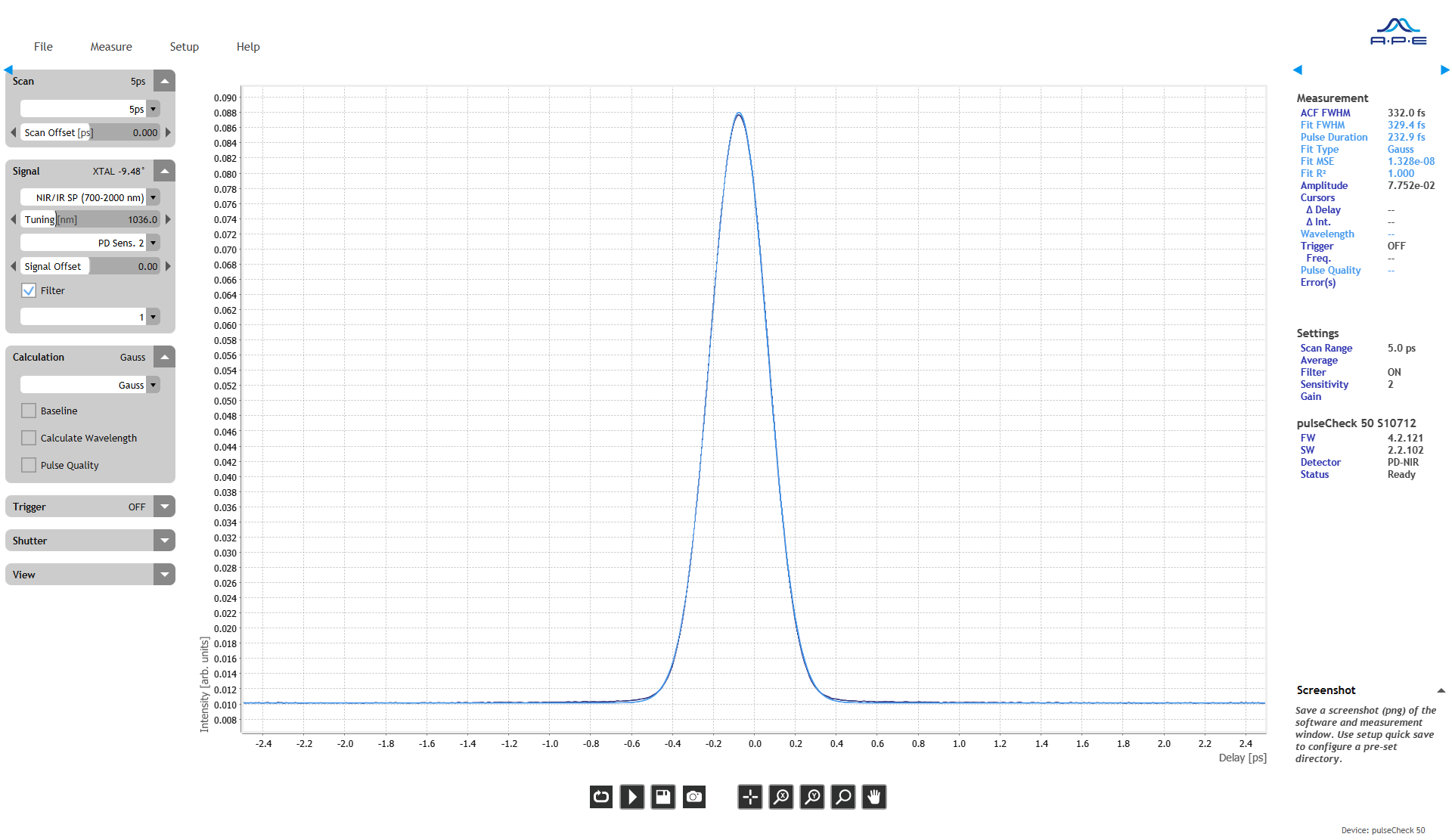 HELIOS-20W-HP(50kHz/400μJ)出厂脉宽测试,脉宽=232.9fs |