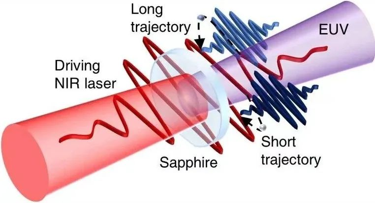 高次谐波产生是当气体原子暴露于强飞秒激光场中时,其电子首先通过隧道效应逸出,随后在激光电场中被加速并与原核发生再碰撞,放出高能量光子,产生高于初始激光频率的光谱。这种机制允许生成极端紫外线和软X射线,其潜在应用包括超短脉冲光源、时间分辨的分子动力学研究、以及为纳米尺度成像提供新的工具。
