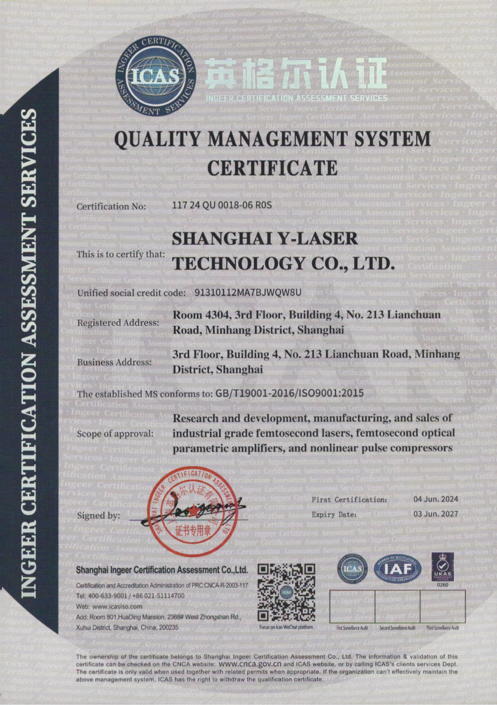 作为一家在飞秒激光领域持续发展的企业,上海镱镭飞秒激光技术有限公司一直致力于推动创新、提高飞秒激光水平,并不断为客户提供卓越的产品和服务。这次获得认证,是对我们管理体系和服务质量的充分肯定。