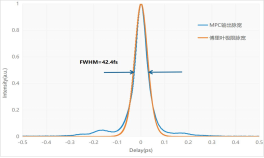 图左 :MPC压缩后输出的典型脉冲宽度,FWHM =42.4fs;图右 :MPC输出后输出的典型展宽光谱