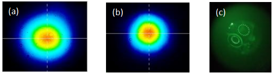 (a): MPC入射口的光斑图样 (b): MPC出射口的光斑图样 (c): MPC腔镜上的光斑分布
