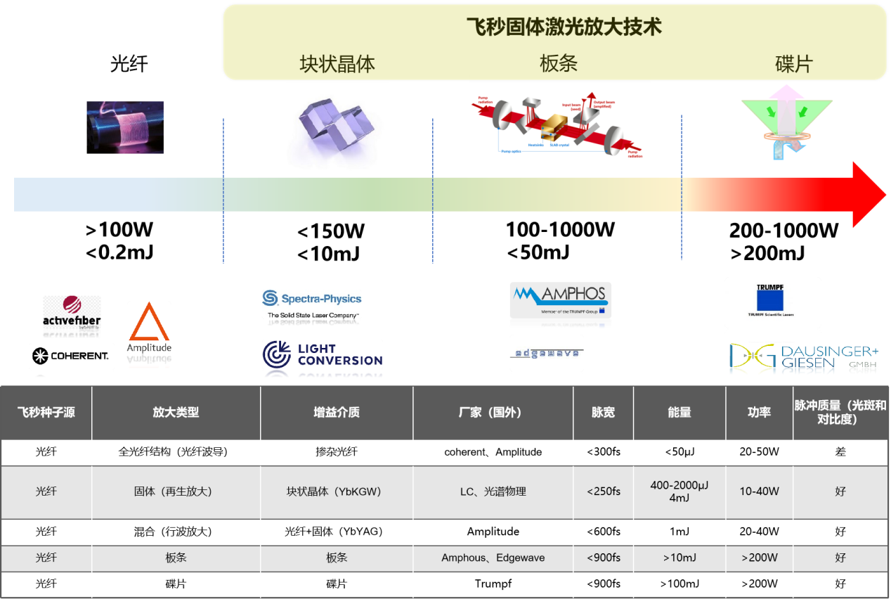 目前市场上的主流工业/科研用高能量飞秒激光器主要分为两类:全光纤结构的飞秒激光器和基于块状晶体、板条、碟片三种不同增益介质的飞秒固体激光器。这两种激光器在设计、性能、应用及成本效益等方面各有特点。全光纤结构激光器以其集成性和稳定性以较低的技术门槛在某些应用领域中占据优势,而固体激光器则以其兼具高能量和高功率以及干净的脉冲质量能力在高端应用中表现出色。