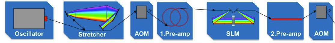 原理上光纤激光器的放大过程是:①当啁啾脉冲通过掺杂光纤时,光纤中的稀土离子被外部泵浦光激发,产生了所需的能量级跃迁。②光脉冲与这些激发态的离子相互作用,导致能量从离子转移到光脉冲上,从而实现放大。