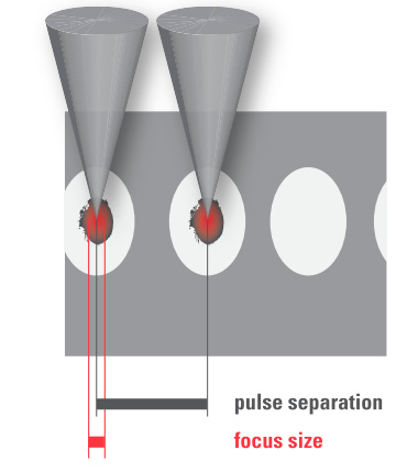 图12 (a)脉冲能量高,重复率低(斑点分离大);(b)脉冲能量低,重复率高(光斑分离小,光斑重叠等离子体效应)