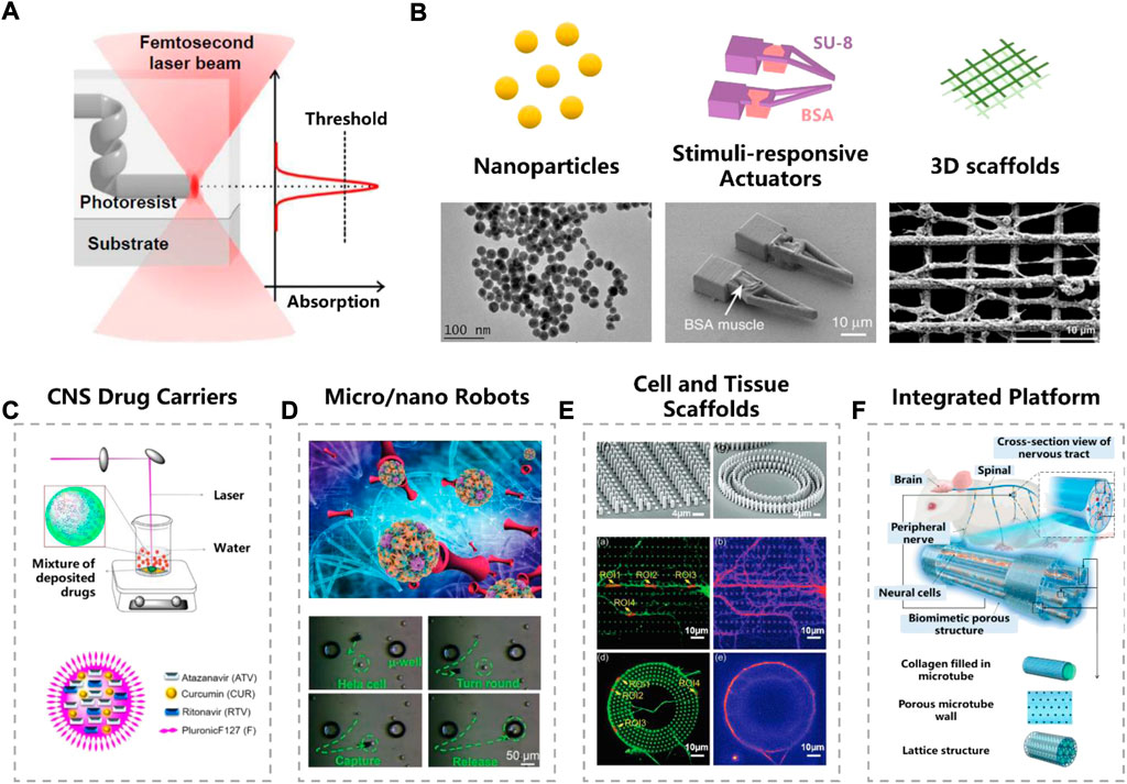 图20飞秒激光在神经生物学研究中的应用。(A)飞秒激光非线性吸收机理。(B)飞秒激光制备的典型微纳结构。(C-E)飞秒激光制作的功能单元。(C)中枢神经系统药物携带者。(D)微纳米机器人。(E)细胞和组织支架(F)综合平台[19]