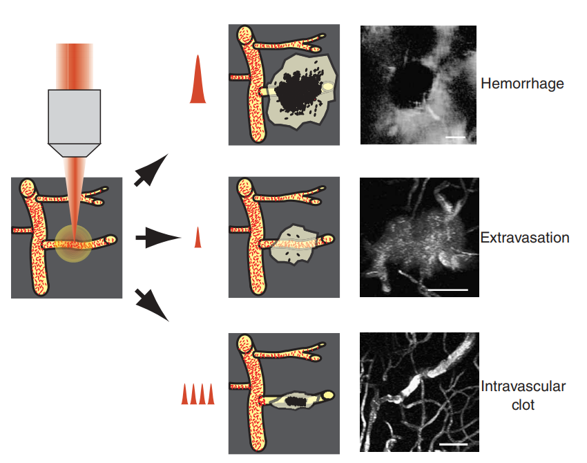 图22飞秒激光消融血管会导致三个明显的血管病变。高能量会导致出血(上),低能量会使血管基本完好,有短暂的泄漏(中),而多次低能量脉冲会导致血管内血栓(下)。[22]