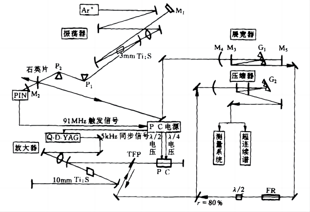 Ti蓝宝石飞秒脉冲的产生和啁啾脉冲再生放大实验结构图