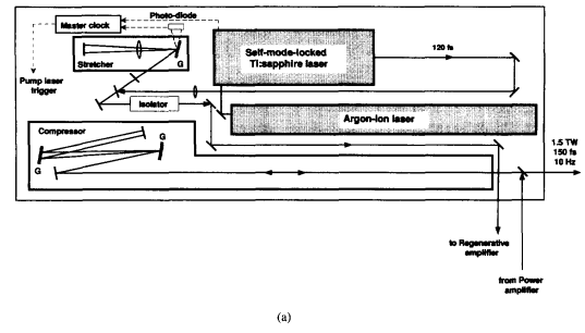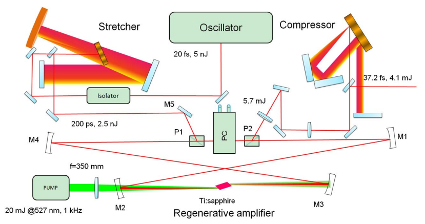 再生放大器系统、飞秒钛蓝宝石激光振荡器、展宽和压缩器的示意图。[12]