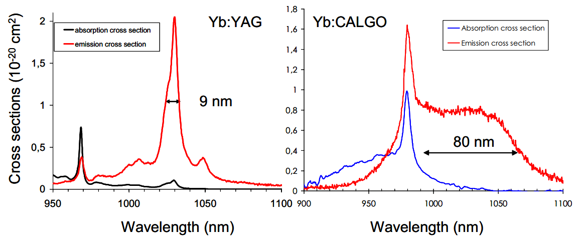 Yb:YAG和Yb:CaLGO的发射光谱和吸收光谱[10]