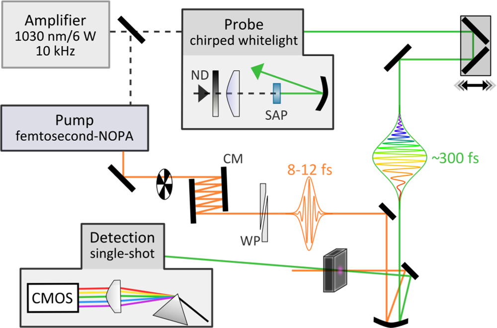 宽带脉冲振动光谱的基频光(黑色,虚线),探测光(绿色)和泵浦光(橙色)波束路径的示意图实验设置。