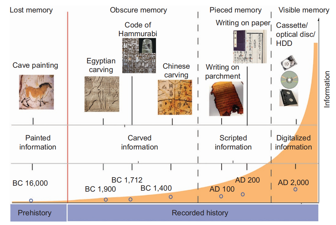 人类社会信息记录的历史演变。AD:公元后;BC:公元前,HDD;硬盘驱动器。[1]
