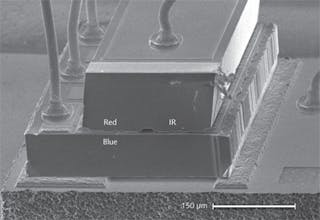 图 1.蓝光光学数据存储系统通常向后兼容光盘 (CD) 和数字视频光盘 (DVD) 系统,因为它们不仅包含 405 nm 蓝色激光器,还包含 780 nm (CD) 和 650 nm (DVD) 激光器,如索尼堆叠芯片配置的 SEM 照片所示。各种波长的发射发生在标记的芯片刻面上。[2]
