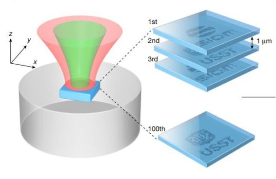2.三维光存储技术:三维光存储技术通过在多个维度(通常是三个空间维度)上存储信息,来实现高密度存储。这种技术可以在同一体积内存储大量数据,比传统的二维存储技术(如CD、DVD)的存储密度要高得多。包括可超越光学衍射极限的双光子吸收 (two-photon absorption,TPA)三维光存储,基于远场超分辨受激发射损耗(stimulated emission depletion, STED)荧光显微三维光存储技术;