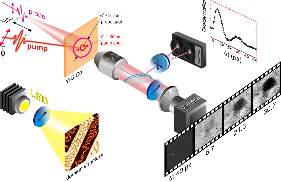 时间分辨磁化动力学和单次成像原理图。附图显示了单脉冲激光激发YIG:Co形成的磁畴的磁光可视化。[11]