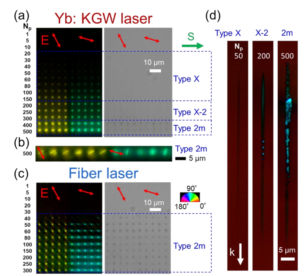 Yb;KGw激光器:能在更广的参数范围内写入各类结构,包括各向异性结构(typeX)和各向同性结构(type1)。在Np<20时无明显双折射,在20<Np<150时出现typeX双折射体素(纳米孔结构),在Np>150时开始出现type2m修改(层状双折射结构)。