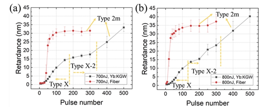 图3:两种激光器中双折射体素的延迟与写入脉冲数的关系。脉冲能量(a) 700 nJ (b) 800 nJ