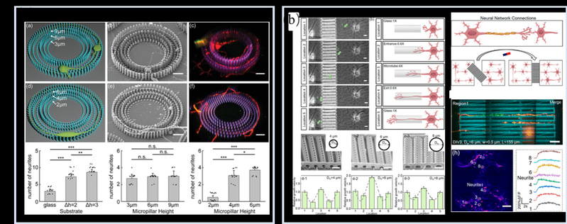微纳结构对神经元轴突生长的影响:(a)神经元轴突沿着相同高度微柱定向生长;(b)多孔微管能够加速神经元轴突生长并可实现神经元的定向连接。[9]
