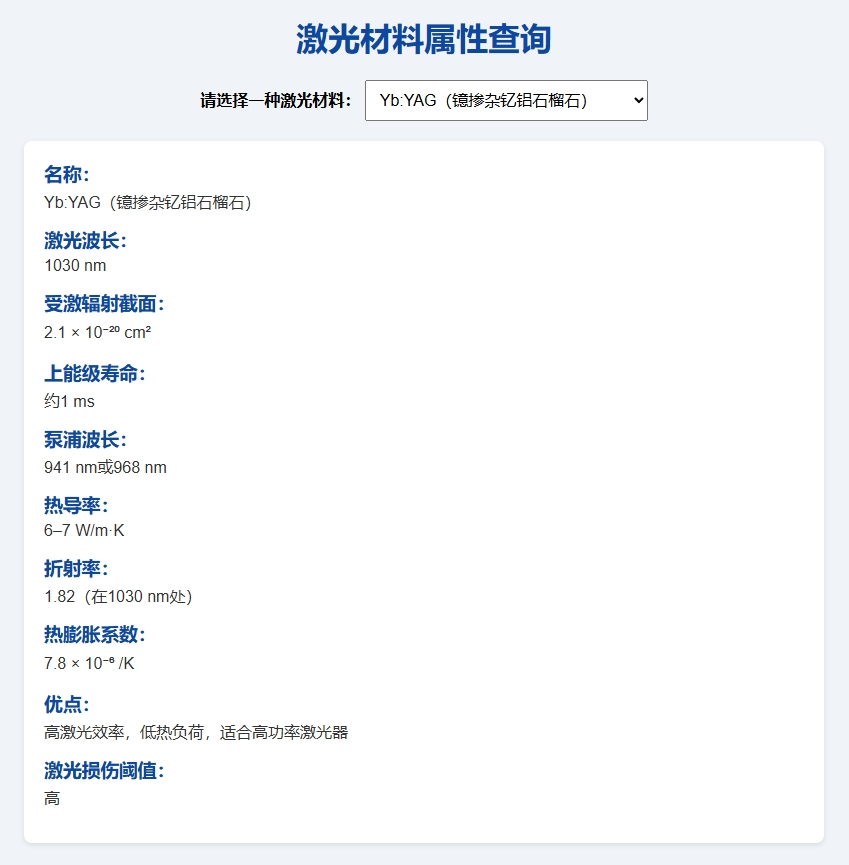在下拉菜单中选择所需查询的激光材料。