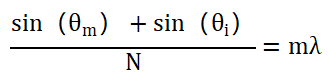 衍射角公式: 其中: · N为光栅的光线密度,单位通常为每毫米的线数(1/mm)。 · m为衍射级次,可以为正或负整数。 · λ为入射光的波长,单位为纳米(nm)。 · θi为入射角,单位为度(°)。 · θm为衍射角,单位为度(°)。 通过该公式,可以解出衍射角θ: θm=arcsin(mλN-sin(θi)) |