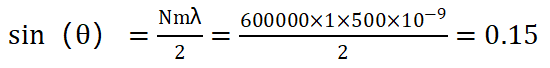 单位转换: N=600线/mmx1000=600000线/m λ=500nm=500x10-9m θi=30°x(π/180)=0.5236弧度 |