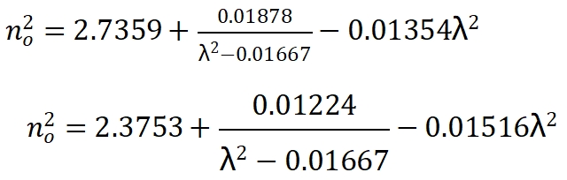 | 折射率方程(Sellmeier方程) 每种晶体都有特定的折射率计算公式,例如: BBO晶体(λ单位为μm): ![]() |