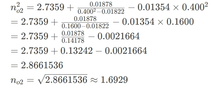 | 我们以800nm激光在BBO晶体中的I类相位匹配(O+O→E)为例,详细展示计算过程。 已知条件: