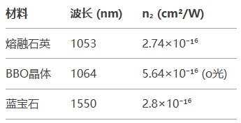 2.非线性折射率(n₂):取决于材料,如熔融石英(Fused Silica)在1064 nm下约为2.74×10⁻¹⁶ cm²/W。