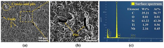 图 1.初始表面的SEM图像和EDS元素分析。(a) 初始表面形貌,(b) 插图的部分放大细节 (a,c) 插图的 EDS 元素分析 (b)。