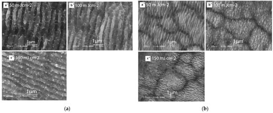 .AISI 304不锈钢在空气环境中的波纹加工。(a) 不同通量的消融区域中心,(a') 50 mJ cm−2; (b')100 兆焦耳 cm−2; (c')150 兆焦耳 cm−2; (b) 不同通量的消融区域周边,(a') 50 mJ cm−2; (b')100 兆焦耳 cm−2; (c')150 兆焦耳 cm−2.“经参考文献[38]许可转载,版权所有(2013),施普林格·自然”。