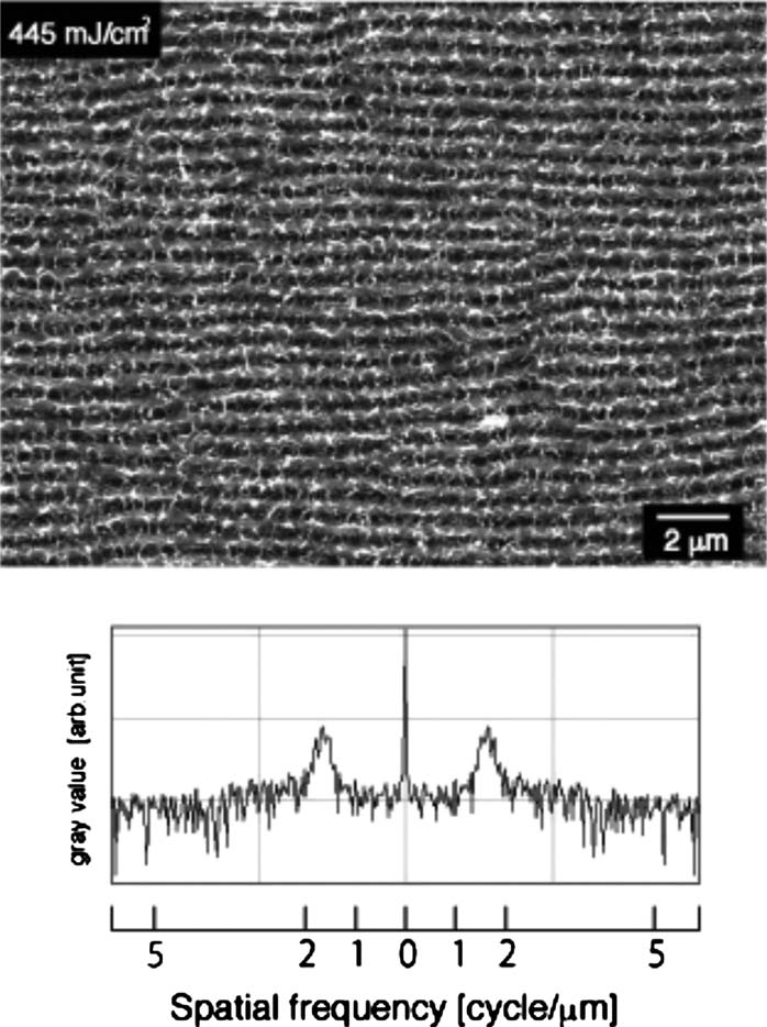 激光影响下,50次160 fs激光脉冲产生的钨表面周期性结构的SEM图像445mJ/cm2和傅里叶变换谱。[1]