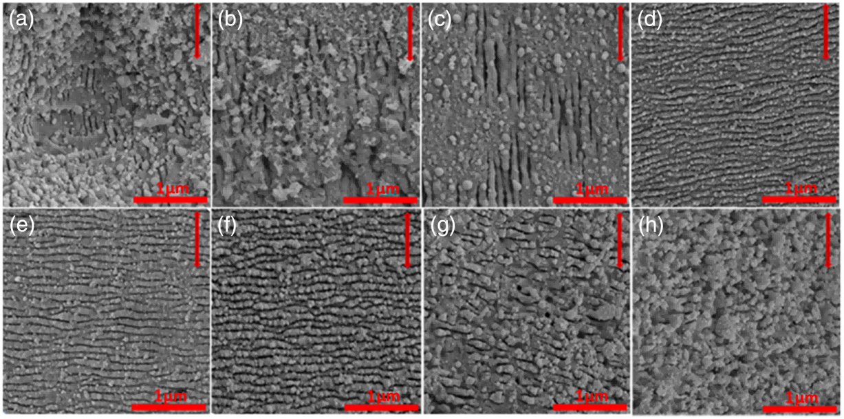样品温度分别为(a)28°C、(b)100°C、(C)200°C、(d)300°C、(e)400°C、(f)500°C、(g)600°C、(h)800°C时,氮气环境下激光处理LN表面的SEM图像。Fluence,7.0kJ/m2;N2压力,500 Torr;扫描速度,2毫米/秒。红色双箭头表示入射激光的偏振方向。[3]
