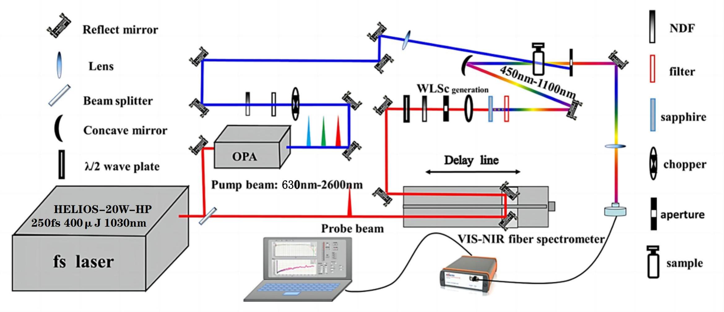如光路图所示,HELIOS-20W-HP 飞秒激光器提供输出为1030 nm波长、250 fs脉宽的初始飞秒激光脉冲。在图中,宽带探测光源由HELIOS-20W-HP 飞秒激光器分光产生,其中的WLS 生成器包含蓝宝石晶体(Sapphire)等非线性光学元件,通过脉冲激光与蓝宝石的非线性相互作用生成450 nm到1100 nm的宽带探测光,同时保留入射脉冲激光的脉宽,重频等特征。