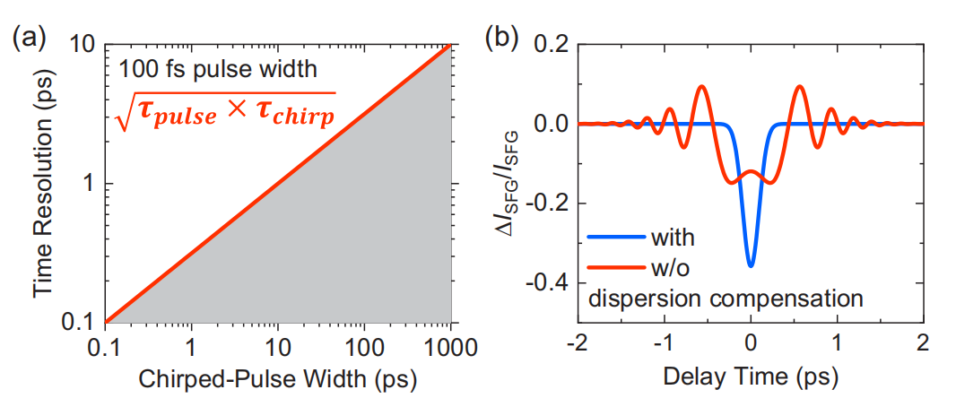 图1.(a)脉冲宽度为100fs的常规啁啾脉冲光谱(红线)的时间分辨率。用常规的方法不能解决灰色区域的问题。(b)具有(蓝色和不具有(红色)色散补偿的200fs高斯调制的仿真结果