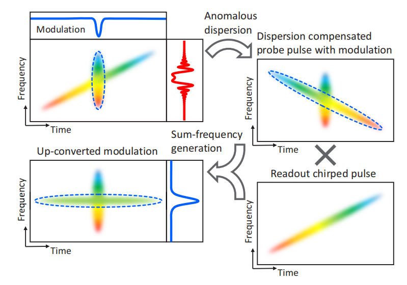 图2所示。具有色散的啁啾脉冲上转换光谱原理图补偿。然后将超快调制信号编码到啁啾探测脉冲中采用异常色散进行色散补偿。相反,一个啁啾读数制备脉冲,最后在两个脉冲之间进行和频产生得到无波形失真的上转换调制信号。
