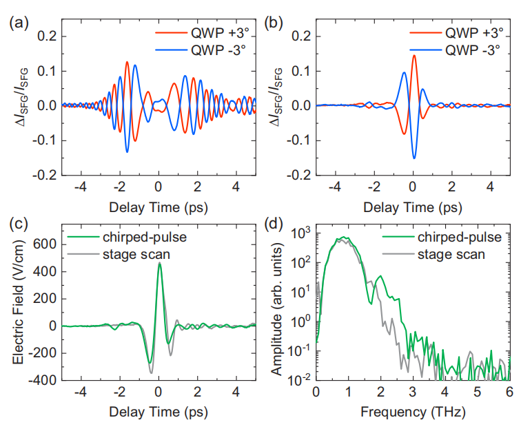 图3.上转换太赫兹诱导调制信号(a)没有和(b)有色散补偿的正(红色)和负(蓝色)相位偏移角。(c)经色散补偿后检索到的太赫兹波形(绿色)和常规级扫描得到的波形(灰色)。(d)每种方法的傅里叶谱。