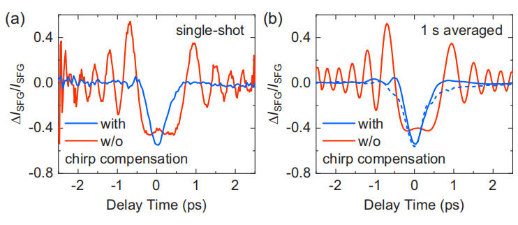 图4.用啁啾脉冲上转换光谱测量LiNbO3晶体的克尔旋转信号,(a)单次测量,(b)在(蓝)和(红)色散补偿下平均超过500个脉冲(1 s)。(b)中的折线表示具有色散补偿的两倍的加性GDD结果。