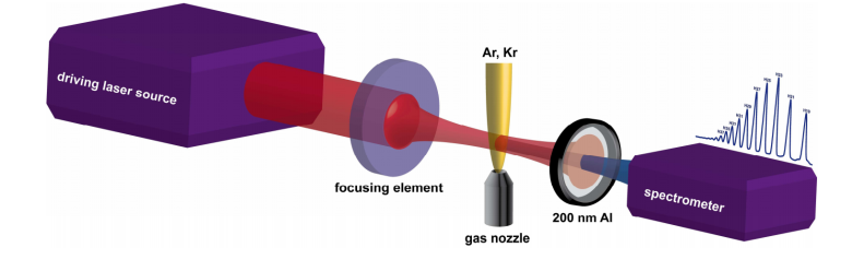 当强飞秒激光脉冲作用于原子或分子时,会使电子被释放并在激光场中加速,随后再与其原始母体重新结合,释放出极紫外高能光子,形成高次谐波。这些密集的高次谐波可以被特定滤波器选择和压缩,从而产生孤立的阿秒脉冲。高次谐波是阿秒脉冲产生的重要技术,恰好可以涵盖EUV光刻生态链条中大家都喜欢的13.5nm波段。