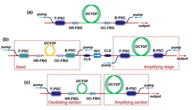 图1所示。光纤激光器的三种结构示意图。(a)基于fp -光纤腔的光纤激光振荡器;(b)基于MOPA结构的光纤激光放大器;(c) OAIFL(oscillating-amplifying integrated fiber laser)