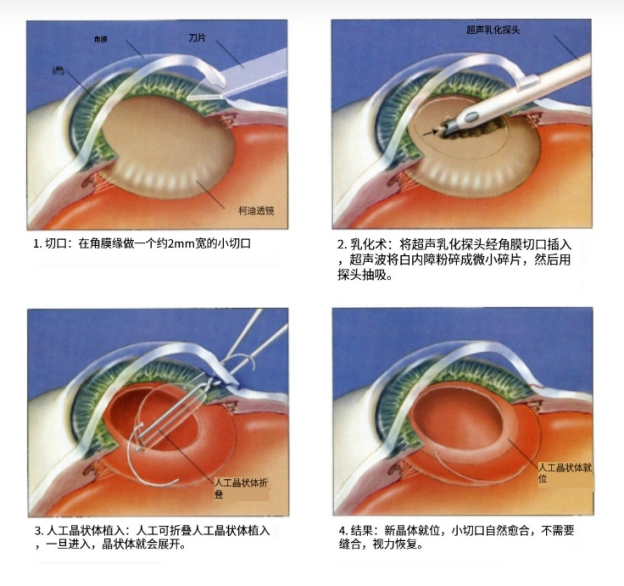 白内障超声乳化术是常见的一种手术,主要是通过超声波将晶状体核粉碎,使其呈乳糜状,随后将其和皮质吸出,植入房型人工晶状体,由于该手术可保留患者晶状体后囊膜,所以患者术后视力恢复快。[11]