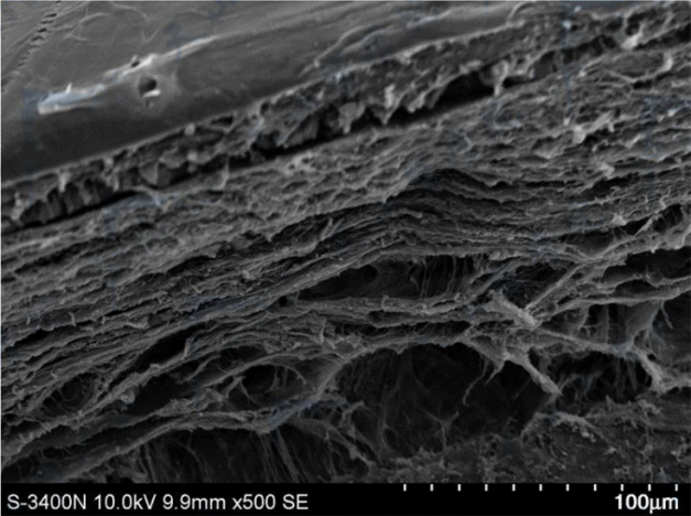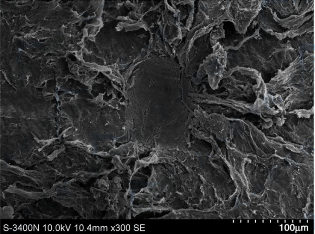 图9左图:角膜组织在飞秒激光(脉冲持续时间220~580fs,脉冲功率为190mW,频率为500kHz)聚焦后发生空化作用产生的超大气泡压痕。