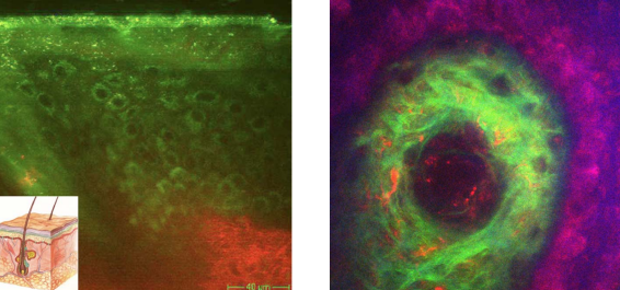 图 21光学活检与多模态多光子断层摄影。左:垂直皮肤切片。右:水平0.2x02mm2覆盖部分(蓝色:共聚焦反射,红色:双光子激发自发荧光,绿色:胶原蛋白的SHG)在皮肤深度80 μm[20]