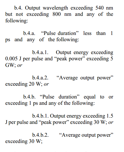 B.4.输出波长超过540 nm但不超过800 nm,以及下列任何一种:b.4.a.。“脉冲持续时间”小于1 ps和下列任何一项:b.4.a.1。单脉冲输出能量超过0.005 J和“峰值功率”超过5GW;或b.4.a.2。“平均输出功率”超过20W;