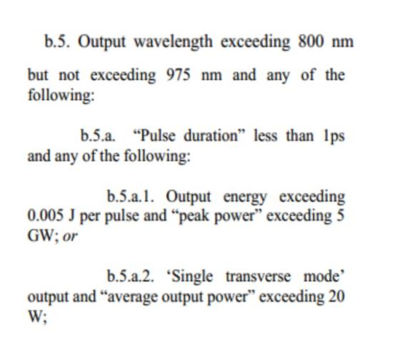 B.5.输出波长超过800 nm但不超过975 nm,以及下列任何一种:b.5.a.。“脉冲持续时间”小于1ps和下列任一项:b.5.a.1。单脉冲输出能量超过0.005 J,“峰值功率”超过5GW;或b.a.2。“单横模”输出,“平均输出功率”超过20W;[22]