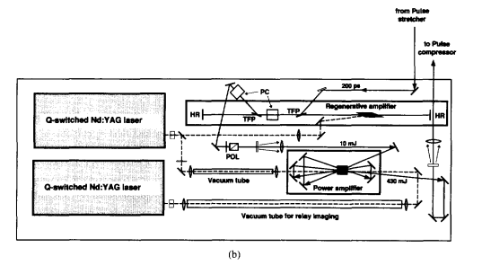 再生放大器系统、飞秒钛蓝宝石激光振荡器、展宽和压缩器的示意图。[12]