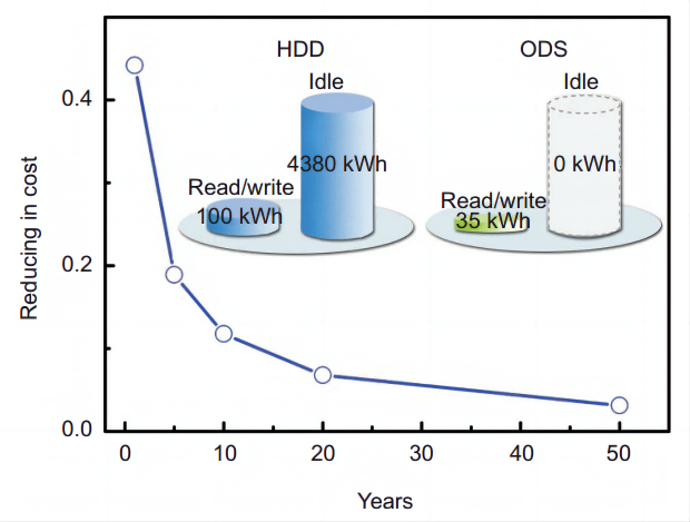 上图显示了50年来单个单元读/写和空闲状态的电力消耗比较。在此比较中,单个HDD单元通常用于读/写消耗20 W,并且以这种方式用于每年100小时。在空闲状态下,每小时功耗为10w。单个ODS单元的读写功耗为7w,每年以这种方式使用100小时。成本是根据假设计算出来的[1]